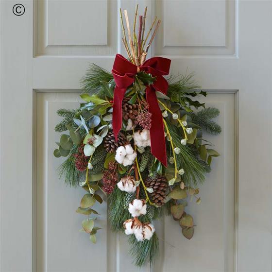 Known as a 'swag' (sort of like a flat bouquet meant for hanging on a door) this beautiful decoration will make the whole street merry. It'll feature fresh blooms and foliage. Expect shades of red and green, with peach and cream highlights and pops of burgundy and cerise.