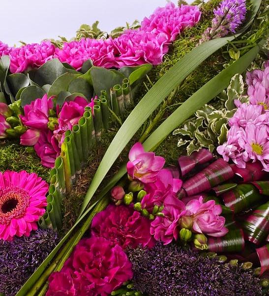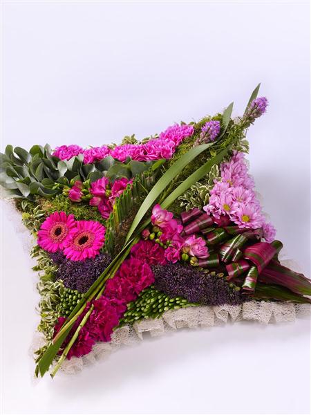 This striking contemporary cushion-shaped design features a selection of flowers in pinks and purples and includes liatris, carnations, germini, freesia and chrysanthemums.