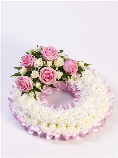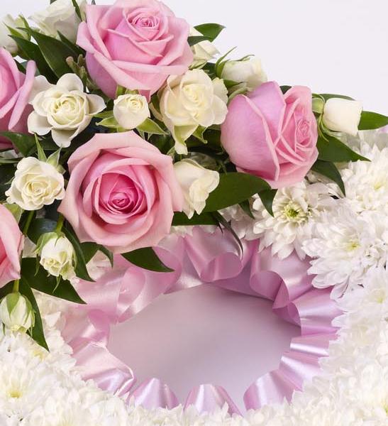 A classic circular wreath covered with a mass of white double spray chrysanthemums and finished with a pink and white spray of roses and spray roses and finished with a pink ribbon trim. Approximate diameter 50cm (19 inches).