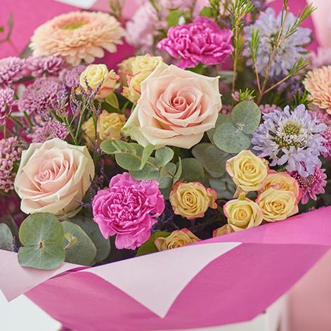 A bouquet of fresh, softly coloured pastel flowers expertly arranged by a local florist.