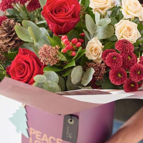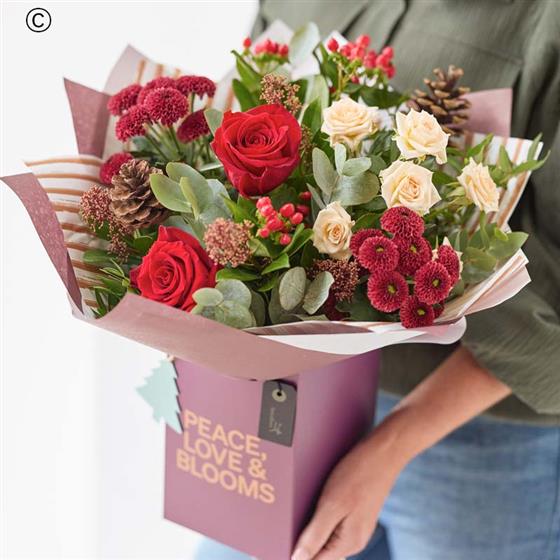 A fabulous festive gift box handcrafted by their local florist, featuring blooms in rich red and green shades, with peach and cream highlights and pops of burgundy and cerise.