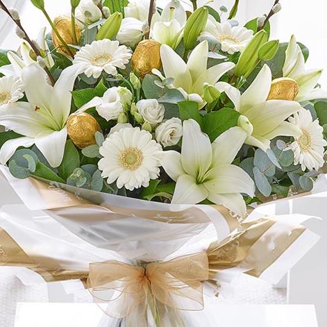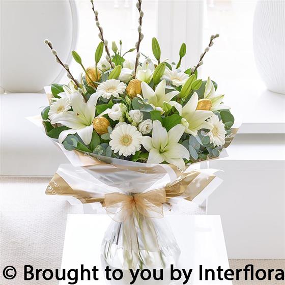 Featuring cream LA lilies, natural pussy willow, white germini and white lisianthus with eucalyptus, salal and foil-covered chocolate Easter eggs, wrapped and presented in Interflora Gift Packaging.