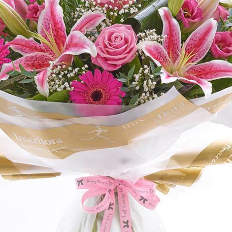 Featuring pink Oriental lily, pink large-headed roses, cerise germinis and pink lisianthus, hand-tied with gypsophila, aspidistra leaves, eucalyptus and salal, wrapped and trimmed with 'Happy Mother's Day' ribbon and presented in Interflora Gift Packaging.