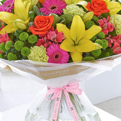 Featuring pink alstroemeria, green carnations, cerise germinis, yellow Asiatic lilies, orange large-headed roses and green spray chrysanthemums with pittosporum and salal, wrapped and trimmed with 'Happy Mother's Day' ribbon and presented in Interflora Gift Packaging.