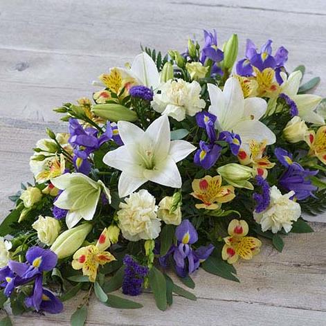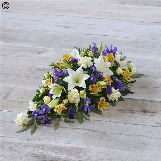 One of our most popular designs, this teardrop shaped arrangement features stunning lemon and blue blooms including irises, lisianthus, and alstroemeria.