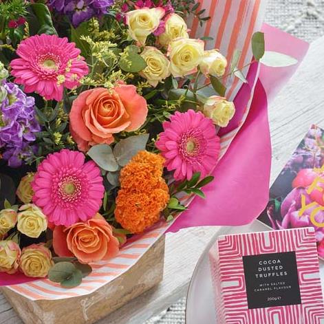 Pull out all the stops this Mother's Day with a vibrant handcrafted bouquet, a luxury Belgian chocolate selection and a lovely 'Just for you' card too. All delivered with love and care by a local florist.