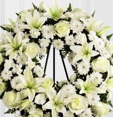 Pure white roses, Asiatic Lily, carnations and spray chrysanthemums are beautifully arranged to form an elegant wreath accented wth lush and vibrant greens. Displayed on a wire easel, this stunning tribute is a wonderful symbol of eternal life.